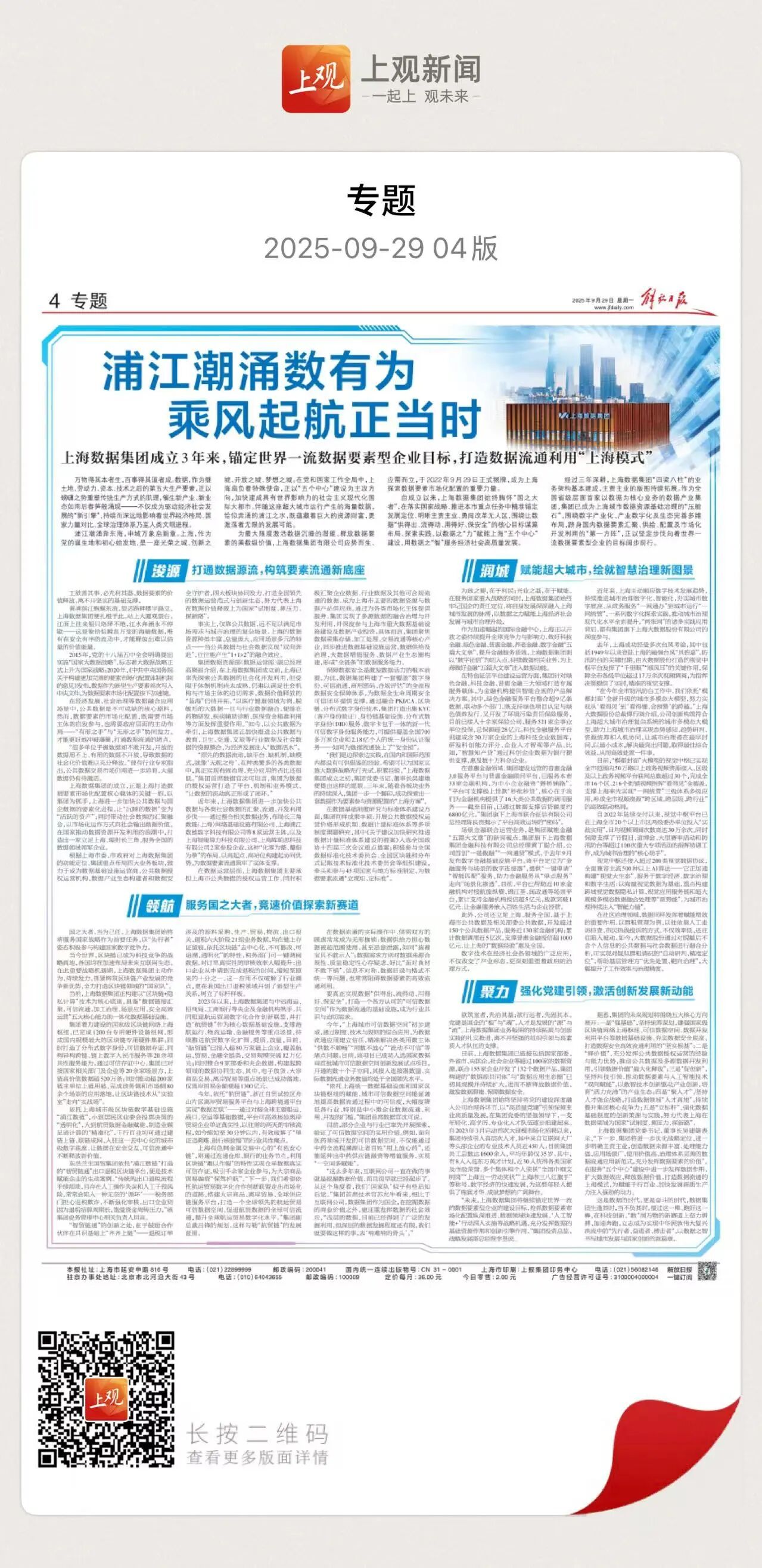 自成立以来,上海数据集团始终胸怀“国之大者”,在落实国家战略、推进本市重点任务中精准锚定发展定位、明晰主责主业、勇闯改革无人区,围绕让数据“供得出、流得动、用得好、保安全”的核心目标谋篇布局、探索实践,以数据之“力”赋能上海“五个中心”建设,用数据之“智”服务经济社会高质量发展。