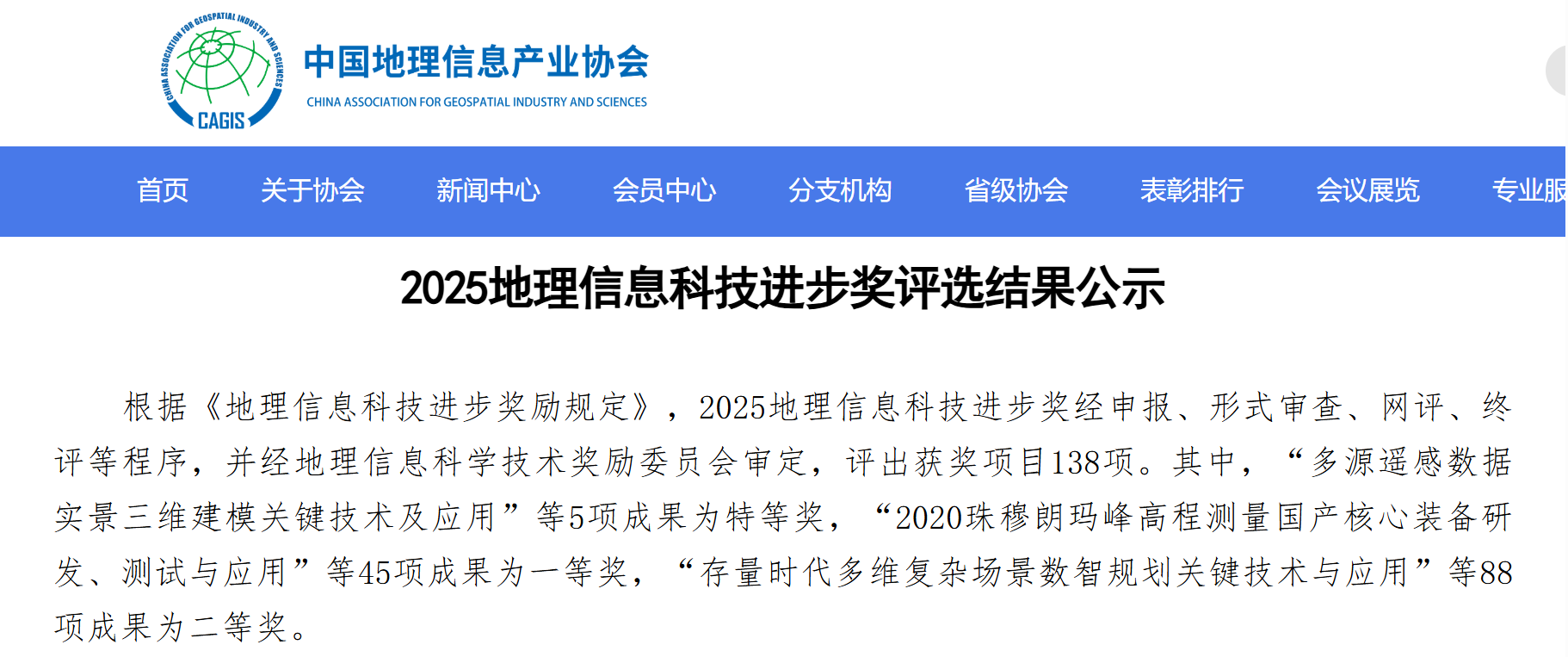 “地理信息科技进步奖”是我国地理信息行业的最高科技成果奖项之一,由国家科学技术部、国家科学技术奖励工作办公室、自然资源部批准设立,中国地理信息产业协会组织评选,主要授予在中国地理信息科学研究、技术创新开发、科技成果推广应用、高新技术产业化、重大工程建设等方面,做出突出贡献的公民、组织。