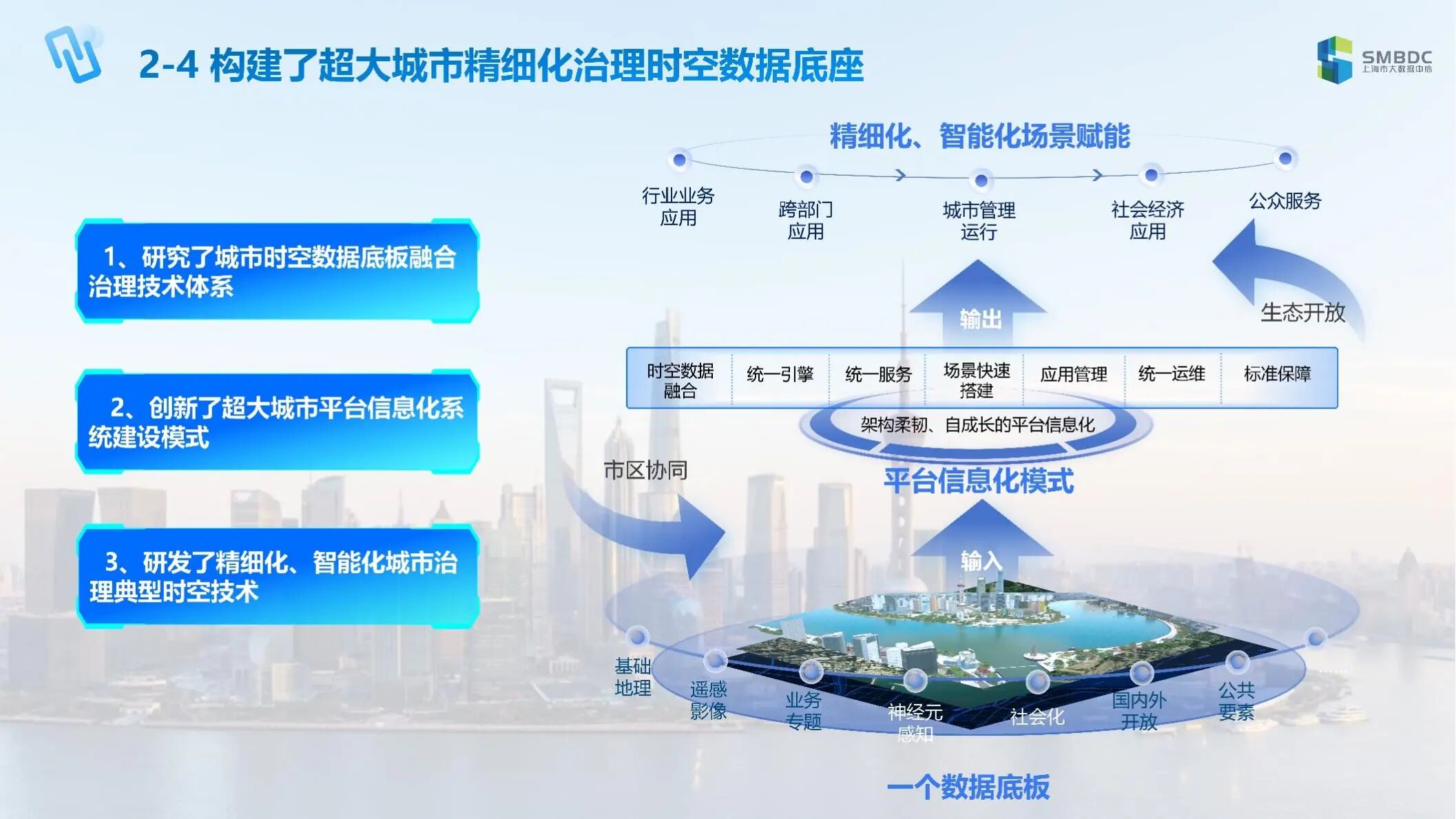 本项目是上海市实施“城市数字化转型”的核心工程,由市领导亲自推动实施。该项目深度剖析超大城市的空间特色、结构特征、总量特点以及超大规模应用需求与复杂系统运转的底层逻辑,解决了时空数据在组织、分析与表达中面临的痛点问题,是国内首个涵盖人、事、数、财的信息化大集中项目,为全球超大城市精细化治理提供了上海模式,贡献了中国智慧。